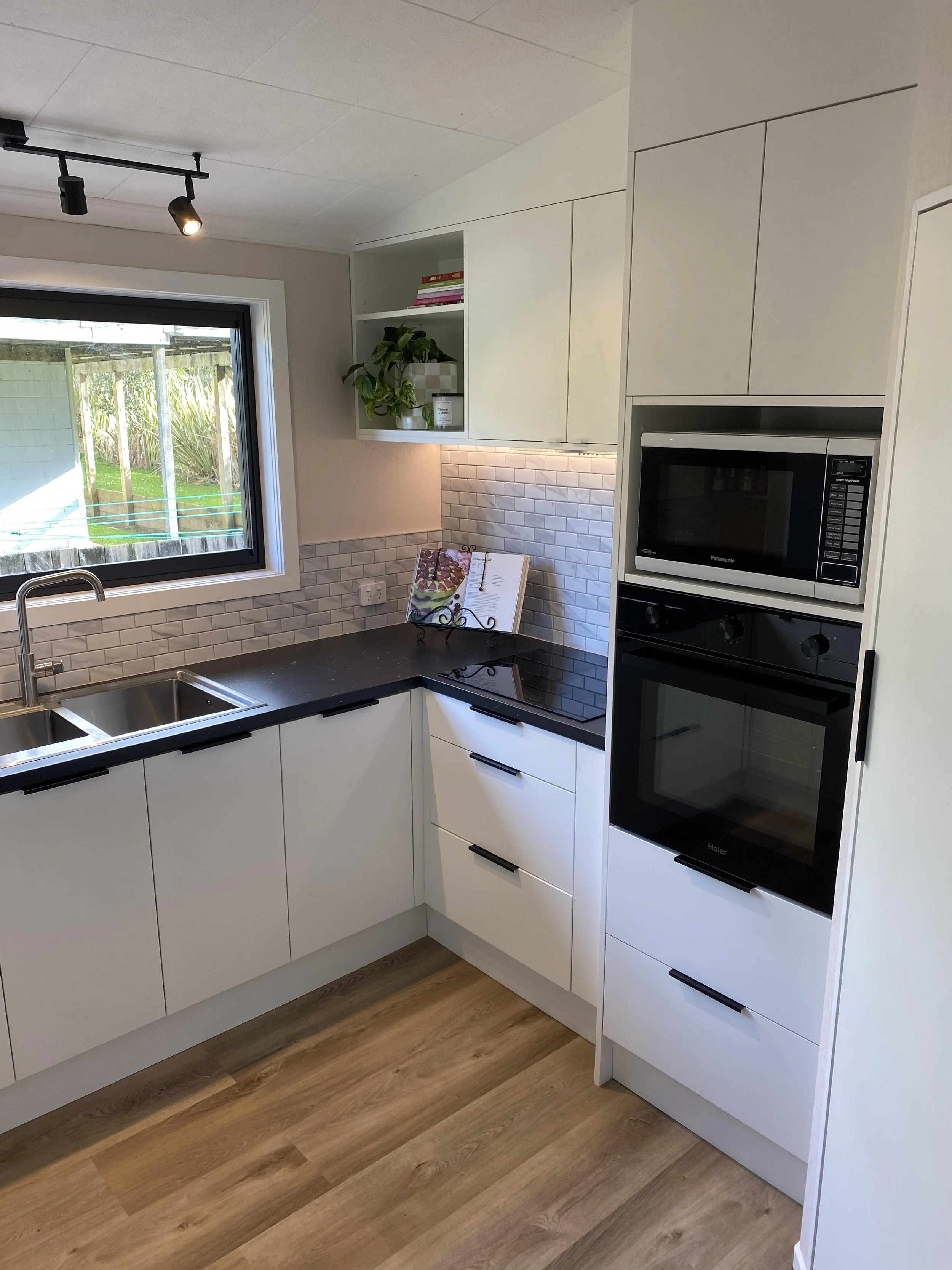 We worked with the wonderful kitchen team at Mitre 10 in Te Rapa and came up with this lovely design that has an effective contrast between the bench top and the cabinetry.